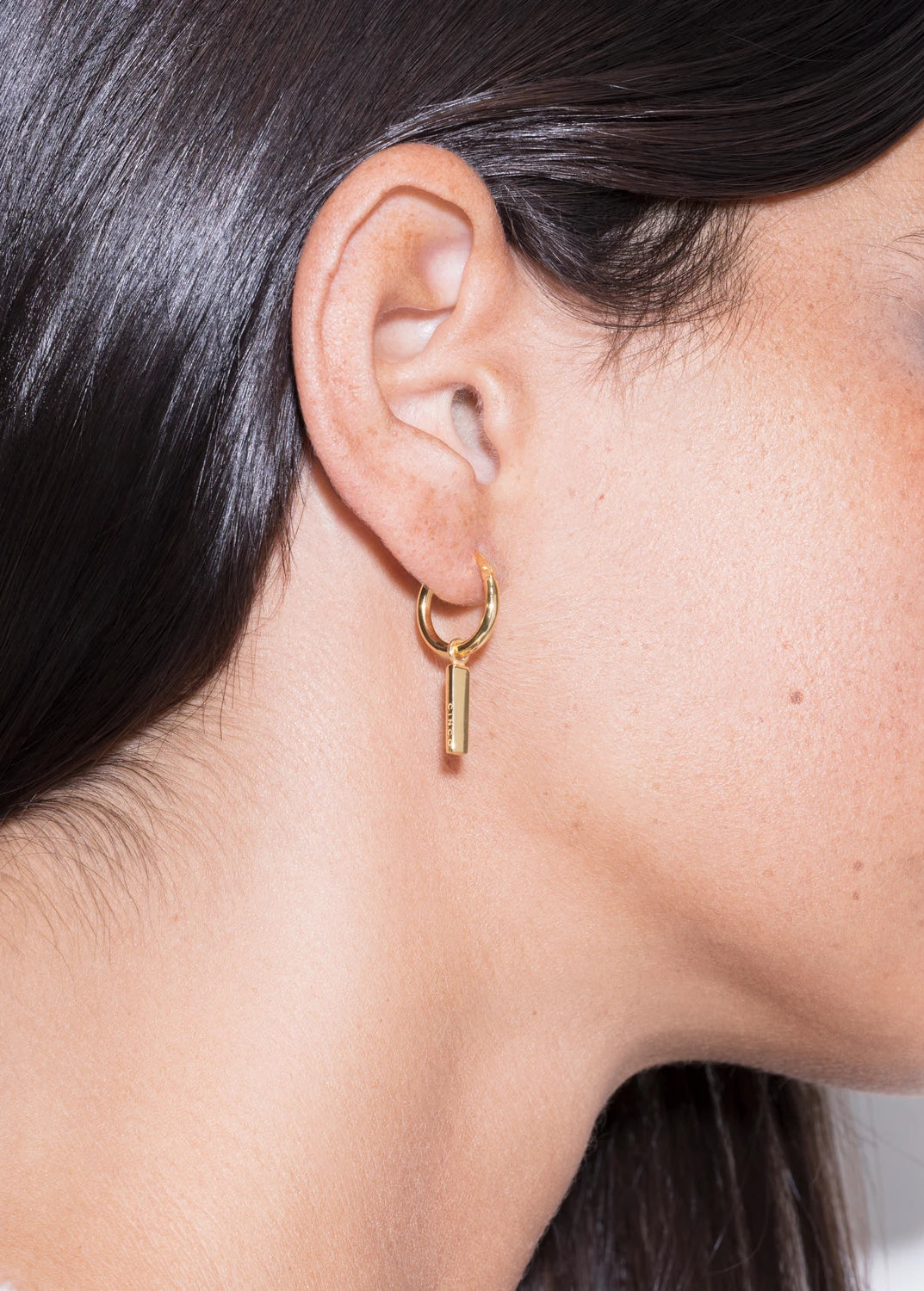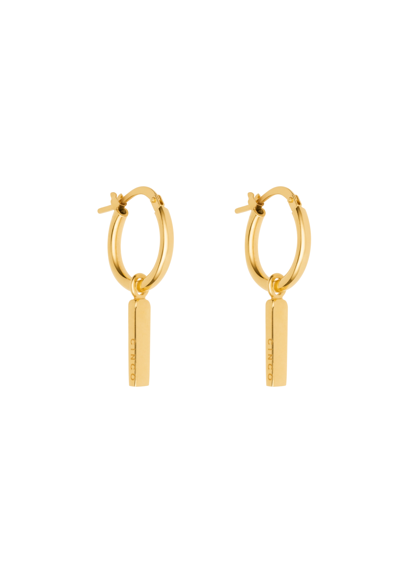 Bela Huggies — simplicity that moves with you. Crafted in Sterling Silver 925, finished in white rhodium or 24k yellow gold plating, these earrings reinterpret the classic huggie with a minimalist vertical charm engraved with CINCO’s signature precision.